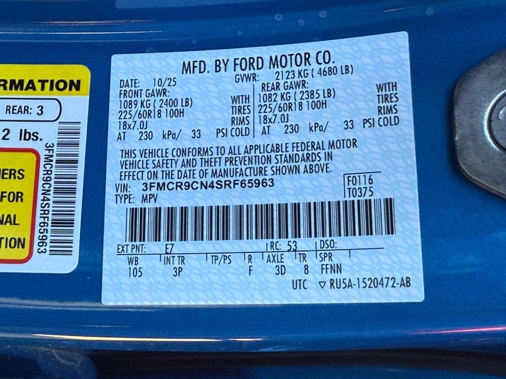 Outer Banks Tech Package+: B&O Sound System by Bang & Olufsen; Connected Navigation; HD Radio. Equipment Group 300A: 18" Ebony Black Wheels; Premium Trimmed Front Bucket Seats W/ebony/roast; 8-Speed Automatic Transmission; 225/60R18 All Season Tires Bsw; AM/FM Stereo; 1.5L EcoBoost Engine. Ford Co-Pilot360 Assist 2.0: Reverse Brake Assist; Front Parking Sensors; 360-Degree Camera with Trail and Split View. Power Moonroof. Velocity Blue Metallic. Front and Rear Floor Liners Without Carpet Mats. **Equipment listed is based on original vehicle build and subject to change. Please confirm the accuracy of the included equipment by calling the dealer prior to purchase.**