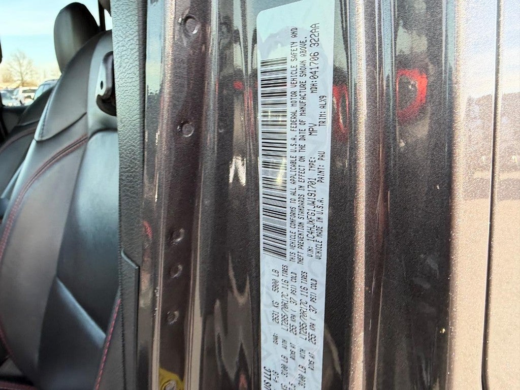 Safety Group: Blind Spot and Cross Path Detection; ParkSense Rear Park Assist System. LED Lighting Group: Daytime Running Lamps LED Accents; Front LED Fog Lamps; LED Reflector Headlamps; LED Taillamps. Quick Order Package 24R. Trailer Tow and Heavy Duty Electrical Group: Class II Receiver Hitch; 700 Amp Maintenance Free Battery; 7 and 4 Pin Wiring Harness; Auxiliary Switches; 240 Amp Alternator. Electronic Infotainment System Group: Roadside Assistance and 9-1-1 Call; SiriusXM Traffic Plus; Alpine Premium Audio System; HD Radio; Uconnect 4C Navigation Radio with 8.4" Display; Rear View Auto Dim Mirror; 8.4" Touchscreen Display; 1-Year SiriusXM Guardian Trial; 5-Year SiriusXM Travel Link Service; GPS Navigation; 5-Year SiriusXM Traffic Service; SiriusXM Travel Link. Body Color 3-Piece Hard Top. Leather Trimmed Bucket Seats. Alpine Premium Audio System. MOPAR Hardtop Headliner. Body Color Fender Flares. Remote Proximity Keyless Entry. Remote Start System. Jeep Trail Rated Kit. MOPAR All-Weather Floor Mats. **Equipment listed is based on original vehicle build and subject to change. Please confirm the accuracy of the included equipment by calling the dealer prior to purchase.**