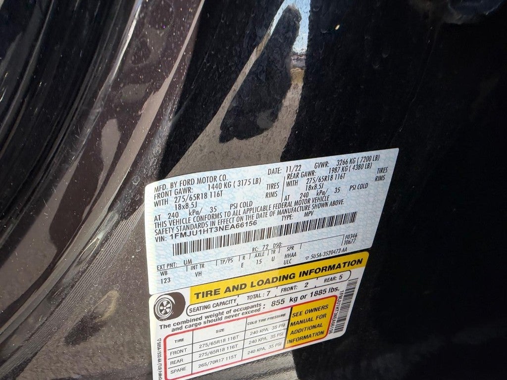 Equipment Group 202A High Package: 18" Machined-Face Aluminum Wheels; Wireless Charging Pad; Power Liftgate; 2nd Row Power-Folding Captain's Chairs; Accent Color Painted Rear Bumper; 7. 200 lbs GVWR; AM/FM Stereo with MP3 Capable; Heated Steering Wheel; Heated/ventilated Front Seats; 110V/150W AC Power Outlet; Power-Folding Sideview Mirrors with Autofold; 3rd Row Vinyl Head Restraints; 4-Door Intelligent Access (lock/unlock); 3.5L EcoBoost V6 Engine; ActiveX-Trimmed 1st and 2nd Row Seats; Power-Adjustable Pedals with Memory; Bright Chrome Plated Accent Platform Running Boards; P275/65R18 AT Tires; SecuriCode Keyless Entry Pad; Power Tilt/telescopic Steering Wheel with Memory; Ambient Lighting; Remote Start; 3.31 Axle Ratio; Advanced Security Pack. ActiveX-Trimmed 1st and 2nd Row Seats. **Equipment listed is based on original vehicle build and subject to change. Please confirm the accuracy of the included equipment by calling the dealer prior to purchase.**